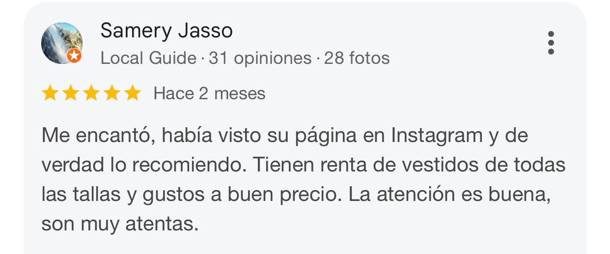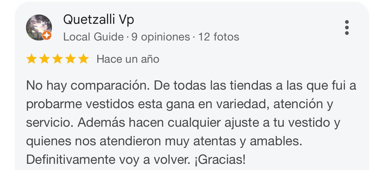 Lo ideal es que visites nuestra tienda ya que ahí encontrarás más vestidos y nos van llegando nuevos diseños continuamente.